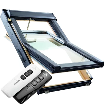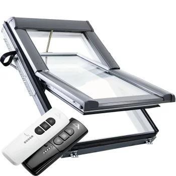 Базовое среднеповоротное мансардное окно Roto для скатной крыши 15–90° на раме из ПВХ-пластика с беспроводным дистанционным радиоуправлением.