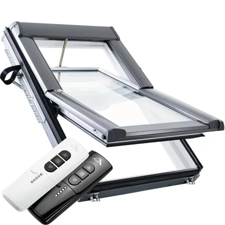 Cреднеповоротное мансардное окно Roto для скатной крыши 15–90° на раме раме из ПВХ-пластика с беспроводным дистанционным радиоуправлением и верхней ручкой.