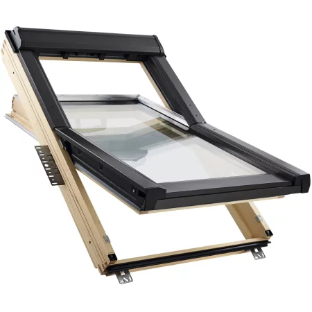 Популярное среднеповоротное мансардное окно Roto для скатной крыши 15–90° на раме из дерева мебельного качества. Ручка снизу.