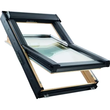 Cреднеповоротное мансардное окно Roto для скатной крыши 15–90° на раме из дерева мебельного качества. Ручка сверху.