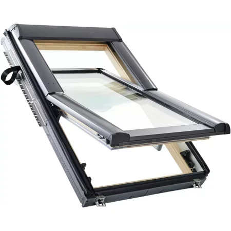 Инновационное окно с приподнятой осью для скатной крыши 20–65° на раме из дерева мебельного качества. Ручка снизу.