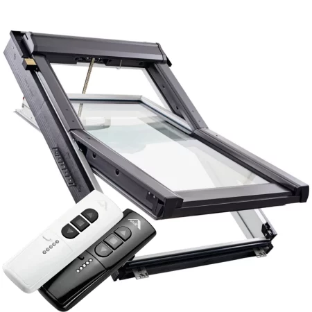 Базовое среднеповоротное мансардное окно Roto для скатной крыши 15–90° на раме из ПВХ-пластика с беспроводным дистанционным радиоуправлением.