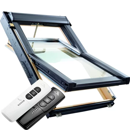 Cреднеповоротное мансардное окно Roto для скатной крыши 15–90° на раме из дерева мебельного качествана с дистанционным управлением. Ручка сверху.